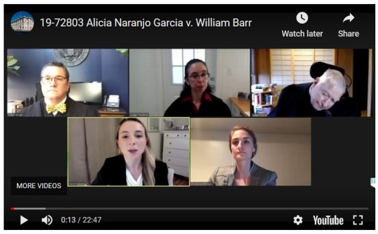 Georgia Law 3L Sarah Nelson argued on behalf of client Alicia Naranjo Garcia in Case No. 19-72803, Naranjo Garcia v. Barr. On account of the covid-19 pandemic, Nelson’s argument was delivered virtually, to a panel composed of Ninth Circuit Judges Ronald M. Gould and Michelle T. Friedland, along with U.S. District Judge Stephen R. Bough, sitting by designation. (Video here; Nelson is pictured above at lower left.)