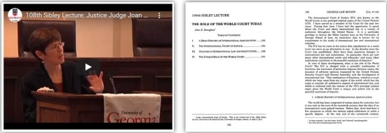 - In April 2012, a little more than a year before her initial election to the ICJ, Donoghue visited Georgia Law’s Athens campus to deliver our 108th Sibley Lecture. Her talk, entitled “The Role of the World Court Today,” (video) outlined the court’s history as the judicial organ of the United Nations, as well as the nature and evolution of its jurisdiction over disputes between nation-states and certain advisory matters. The text was published at 47 Georgia Law Review 181 (2012).