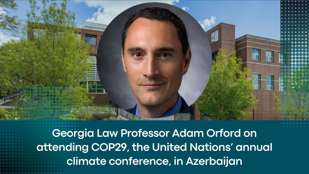 Adam D. Orford, Assistant Professor of Law at the University of Georgia School of Law, participated in the recent 29th Conference of Parties to the United Nations Framework Convention on Climate Change (COP29) in Baku, Azerbaijan. He served as an observer for the American Bar Association. Orford’s interdisciplinary research investigates legal and policy approaches to environmental protection, human health and well-being, and deep decarbonization of the U.S. economy. He also participates in collaborative research initiatives across the University of Georgia, including as lead of the Georgia element of the National Zoning Atlas and as a participant in investigations into the legal, political, environmental and social dimensions of new energy manufacturing and emerging carbon removal technologies.