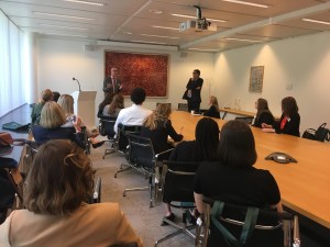 Students spent the morning meeting with lawyers from the Hague Conference on Private International Law. There, they were treated to an overview of the world organization responsible for cross-border cooperation in civil and commercial matters. Students met with Laura Martinez-Mora, Secretary of the Permanent Bureau, and Frédéric Breger, Legal Officer (left). They provided an introduction to the history and structure of the HCCH, and provided a detailed overview of some of its many conventions, which cover topics including: family law matters such as child abduction, intercountry adoption, child protection, and maintenance obligations; forum selection as other procedural issues such as choice of court, taking evidence abroad, service abroad, and apostille. Finally, they touched upon the newly concluded Convention of 2 July 2019 on the Recognition and Enforcement of Foreign Judgments in Civil or Commercial Matters, which Dean Peter B. “Bo” Rutledge, raised during his session on international dispute resolution in Leuven last week. Students were interested to hear about the treaty-making process, as well as the aspects of the treaties, particularly those covering family law, that reinforced human rights treaties, such as the Convention on the Rights of the Child.